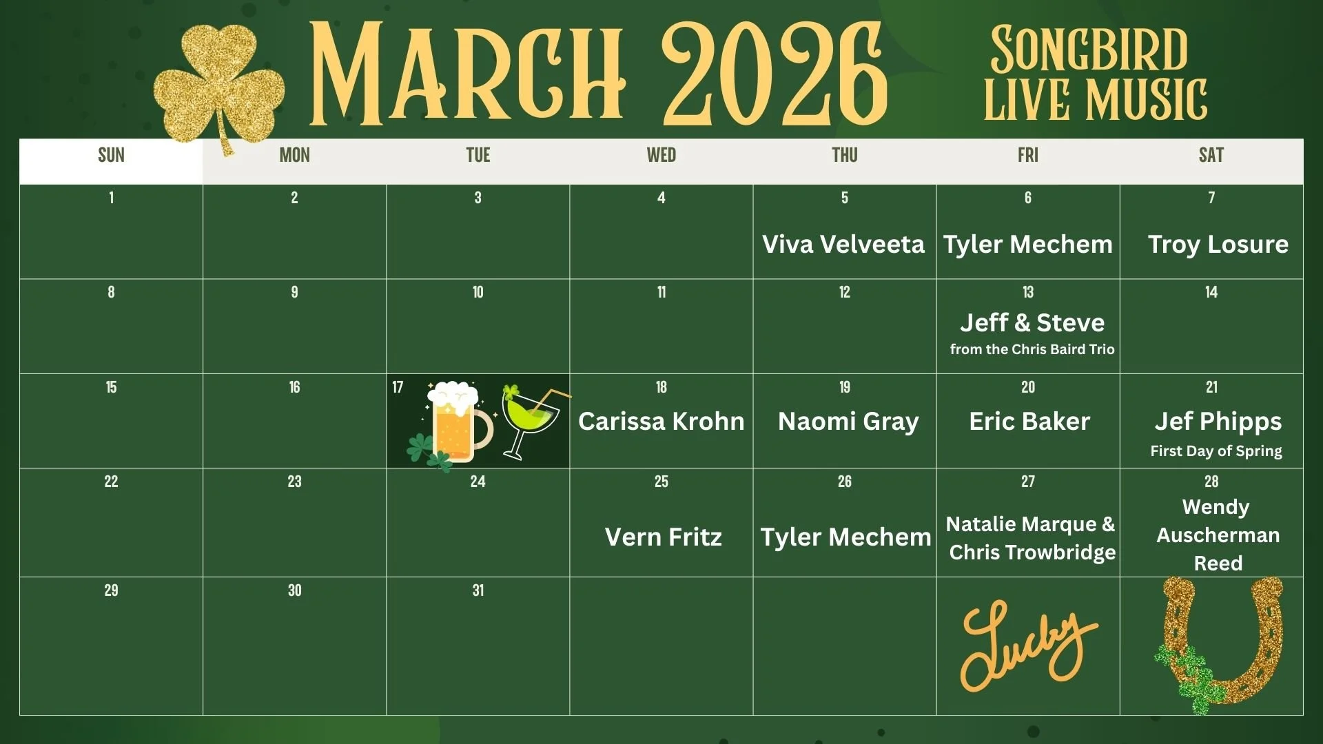 At Songbird Social House, we’re passionate about discovering and showcasing local talent that resonates with the heart and soul of our community. We seek out artists whose music brings people together, creating the perfect atmosphere that aligns with our love for live performances and shared experiences. Whether it's an acoustic singer-songwriter or a dynamic duo, we pride ourselves on curating acts that make every night at Songbird unforgettable.